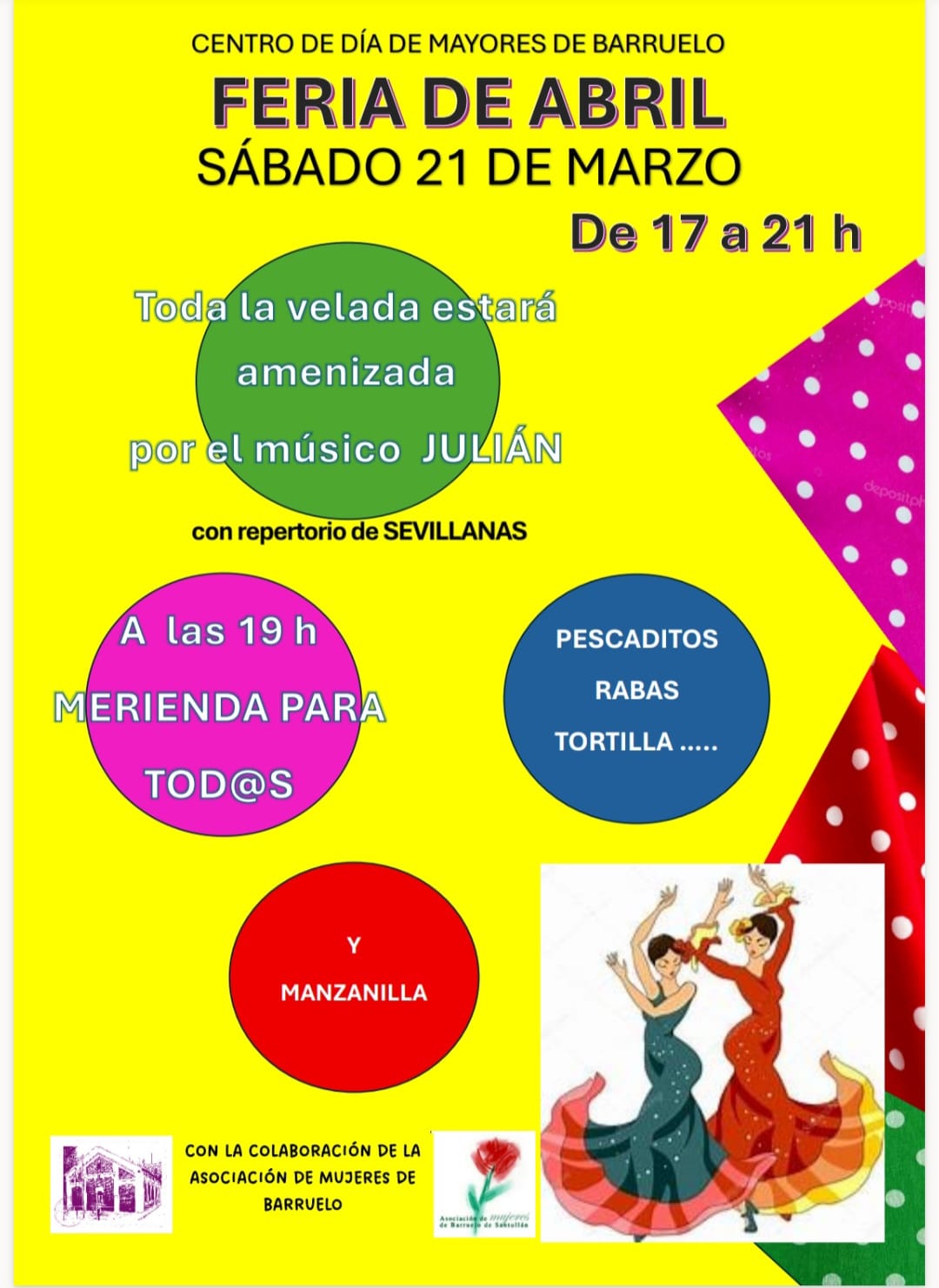 Feria der Abril Sábado, 21 de marzo de 17:00 a 21:00 horas en el Centro de DÃa de Mayores de Barruelo